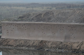 Calling in at Brockholes on the way home the day way rescued by a Barn Owl hunting by number one pit. I only managed a dim photgraphic record shot in the murky dusk light. There were a few Redwing around the reserve along with about 100 Lapwing and small numbers of Pochard, Goldeneye, Gadwall, Mallard and Teal, as well as the ubiquitous coot. Below is a photograph of the man made sand martin wall which is looking rather unattractive at the moment – a bit like the rest of the reserve it must be said. Still a few more weeks and all will be different.