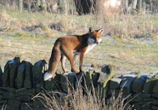 Unfortunately one of the foxes was lame in the front right limb. Although it wasn’t apparent how serious the injury was, hopefully it will only be temporary. The picture of the fox below in the field (not on the wall) is the lame one.